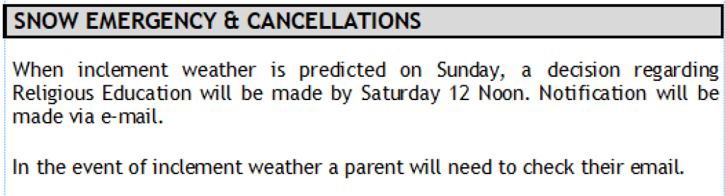With the impending threat of substantial snow accumulation on Sunday, January 25th, please tune-in to WGAL television or go to their website to see if there are any changes to our regular Sunday Mass Schedule before heading out.