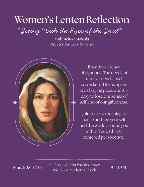 - Women of the parish—do you ever feel stretched by busy days and heavy responsibilities? Life moves quickly, and it can be easy to lose sight of our giftedness. You are invited to pause and see yourself and the world around you with a fresh, Christ-centered perspective. Join us for a Women’s Lenten Reflection on Saturday, March 28th, from 9:00 to 11:00 AM.
