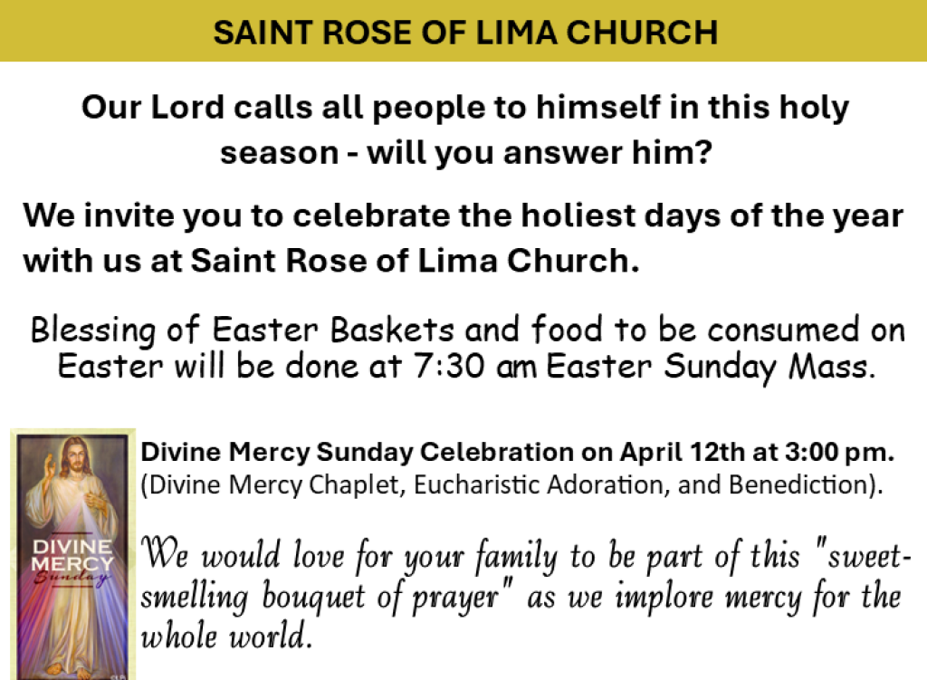 St. Rose of Lima Catholic Church, as members of the Body of Christ, shares the love of God with all by living the Gospel of Jesus. Guided by the Holy Spirit and strengthened by the Sacraments, we strive to deepen our faith through service, education, and outreach to those in need.