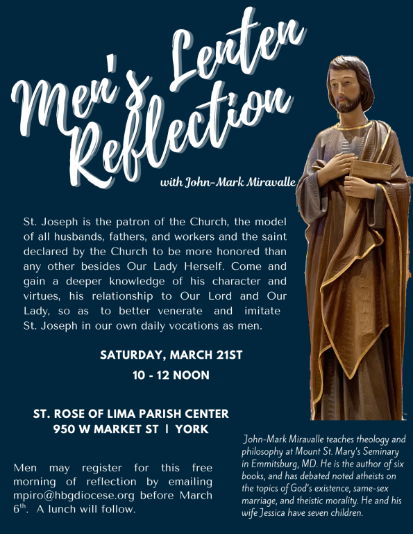 - Men of the parish, during this Lenten season you are invited to grow deeper in your devotion to St. Joseph—the patron of the Church, model of husbands and fathers, and faithful worker. Come learn more about his virtues, his relationship with Our Lord and Our Lady, and how we can imitate him in our daily vocations. This Men’s Lenten Reflection will be held on Saturday, March 21st, from 10:00 AM to 12:00 noon.