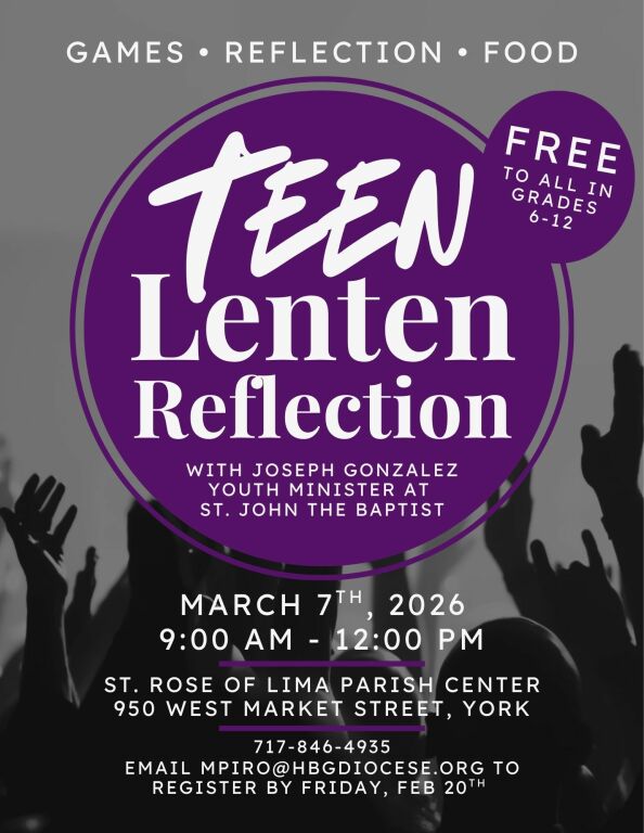 - Teens in grades 6 through 12 are invited to a free Teen Lenten Reflection on Saturday, March 7th, from 9:00 AM to 12:00 noon. We’ll take a closer look at why Lent calls us to prayer, fasting, and sacrifice. The morning will include reflections led by Joseph Gonzalez, youth minister at St. John the Baptist in New Freedom, along with food and fun games. Be sure to check the bulletin and register by February 20th.